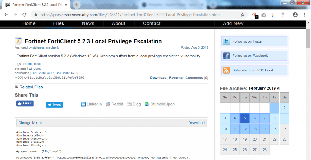 2018-08-05 | Fortinet FortiClient 5.2.3 Local Privilege Escalat | https://packetstormsecurity.com/files/148811/Fortinet-FortiClient-5.2.3-Local-Privilege-Escalation.html