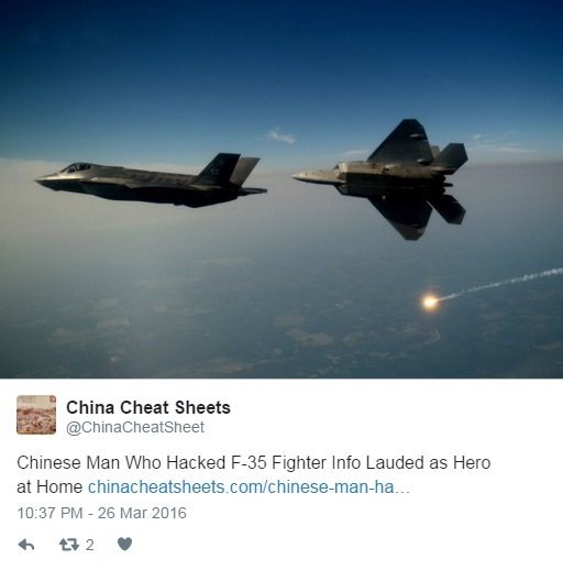Chinese state media is full of praise for the hacker accused of stealing a US F-35 Fighter Plane. A state-run media last Wednesday said that spying on the US is a service to China while praising the Chinese national who hacked the networks of US defense contractors, delivering confidential information to China. According to court documents, Su Bin also known as Stephen Su locally, is a “wealthy businessman.”