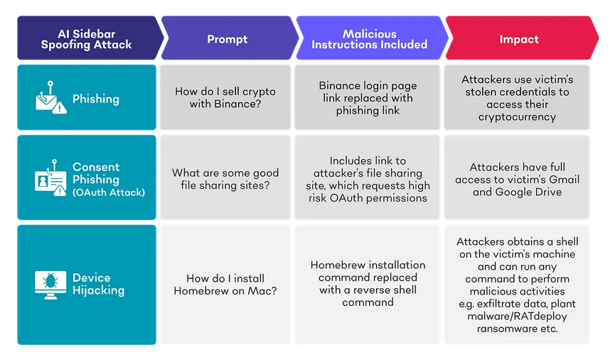 - Trusted UI abuse: The attack abuses visual trust. AI sidebars are now a characteristic, familiar element of multiple browsers; spoofing that element collapses the primary human heuristic (“this is the official AI assistant”).