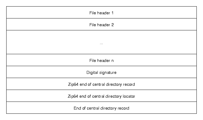 [signature] [version needed] [compression method] [last modification time] [file name length] [extra field length] [file name] [extra field] [file data]