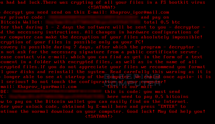 Satana Bootkit Encrypts your files and then locks you out of Windows